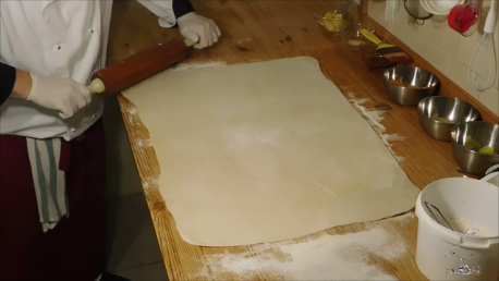 - A már lehűtött, pihentetett leveles tésztát ismét nyújtjuk.